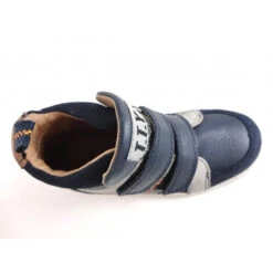 - Basket montante pour garçon en cuir marine, blanc et camel. Fermeture à velcro.