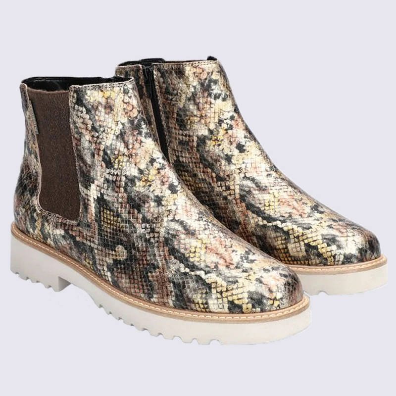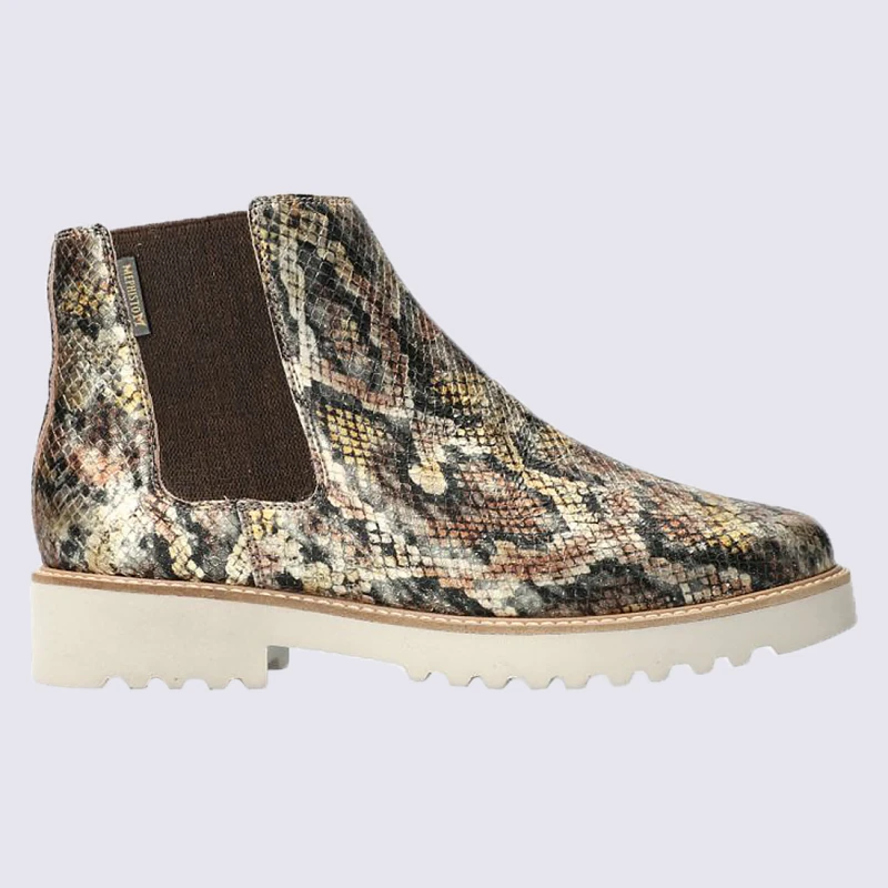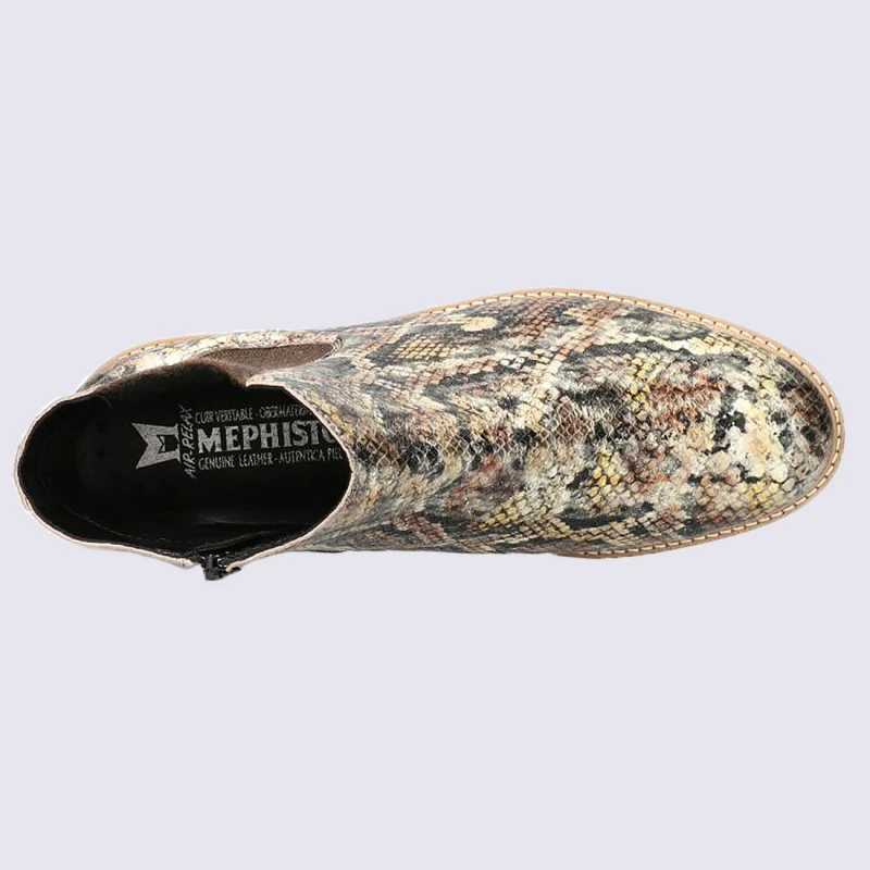 Ces bottines Chelsea de la marque Mephisto vont vous sĂ©duire par leur lĂ©gèretĂ© et leur look ultra-tendance. Le confort de vos pieds sera assurĂ© par sa doublure chaude et douce. Ces chaussures, composĂ©es de cuir, sont imprimĂ©es imitation reptile et multicolore.Â