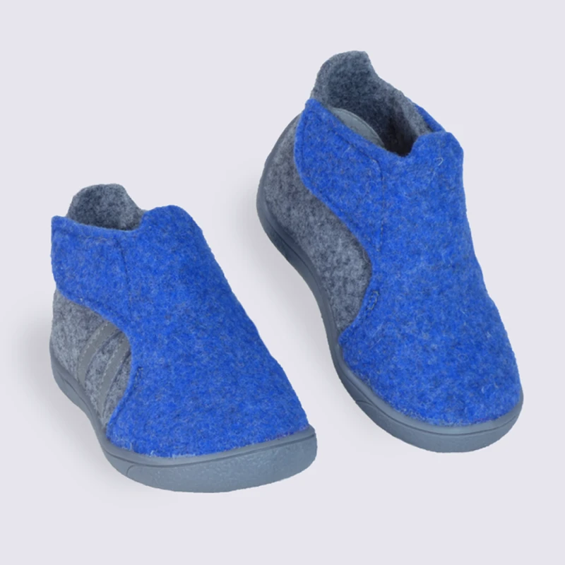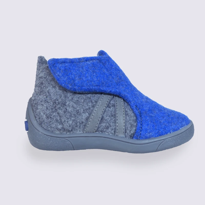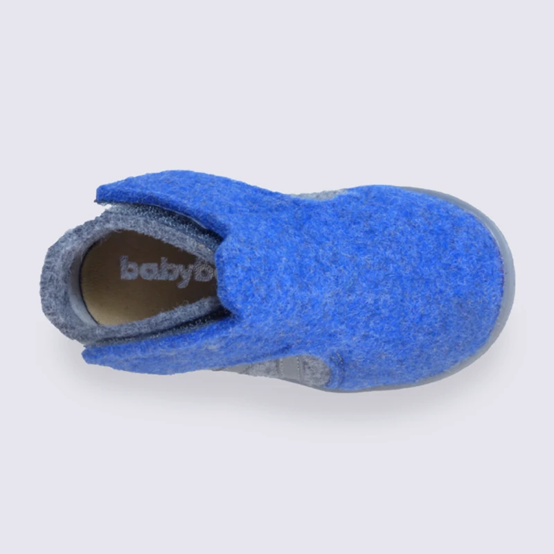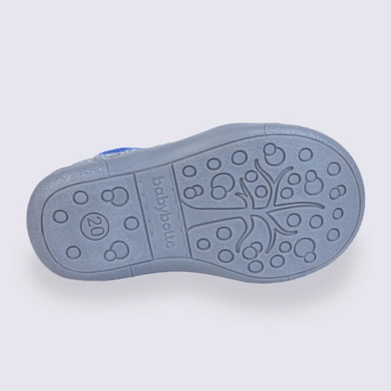 Chausson de la marque Babybotte Petites bandes de cuir sur le côté Fermeture par double velcro Semelle intérieur en cuir amovible Renfort en gomme à l’arrière du chausson Composition : feutre de laine et cuir Livraison gratuite Référence : Max bleu