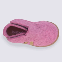 Chausson de la marque Babybotte Petites bandes de cuir sur le côté Fermeture par double velcro Semelle intérieur en cuir amovible Renfort à l’arrière du chausson Composition : feutre de laine et cuir Livraison gratuite Référence : Max rose
