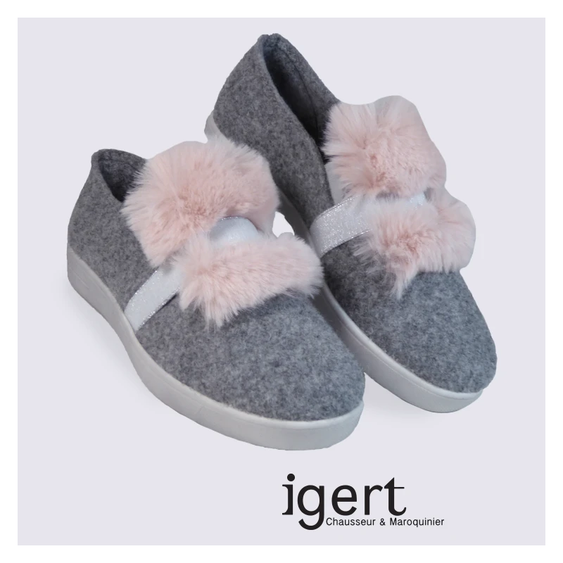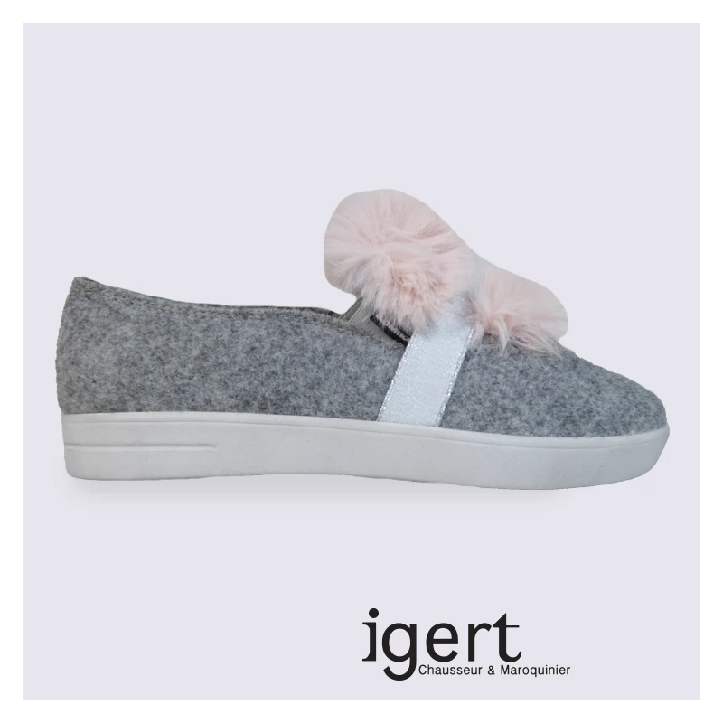 Pantoufles de la marque Romika Modèle gris clair avec élastique argenté et fausse fourrure rose sur le dessus Élastiques de chaque côté pour enfiler plus facilement Composition : feutre de laine et fausse fourrure Talon : 25 mm Semelle PU Livraison gratuite Référence : Nadine home 05 gris