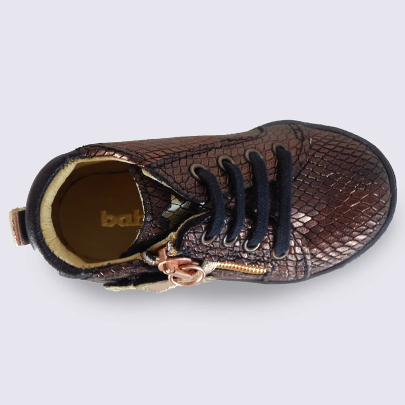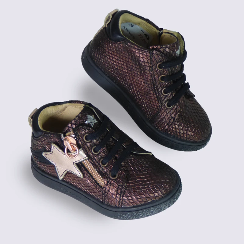 Chaussure de la marque Babybotte Fermeture par glissière Étoile velcro sur la glissière Composition : Cuir Référence : Adrenaline cuivre
