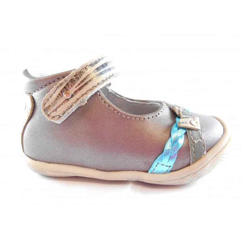 Chaussures bébé fille en cuir Babybotte, super mignonne, conviendront pour une cérémonie, un baptème ou encore un mariage. Composition : cuir Semelle : gomme Renfort avant et arrière Fermeture velcro effet zèbre Petite nattes bleues passant sur le dessus de la chaussure. Référence : Sarawak champagne