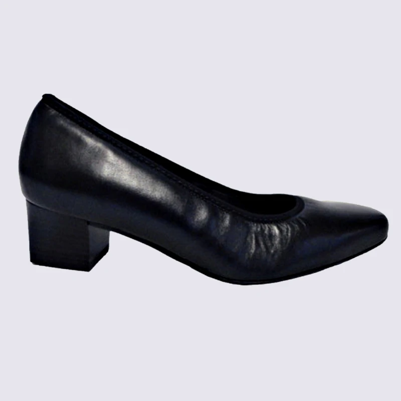 Escarpin en dessus cuir lisse noir entièrement doublé cuir et élastiqué semelle gomme très souple talon de 40 mm. Composition : cuir Référence : 44851 Noir