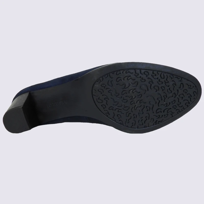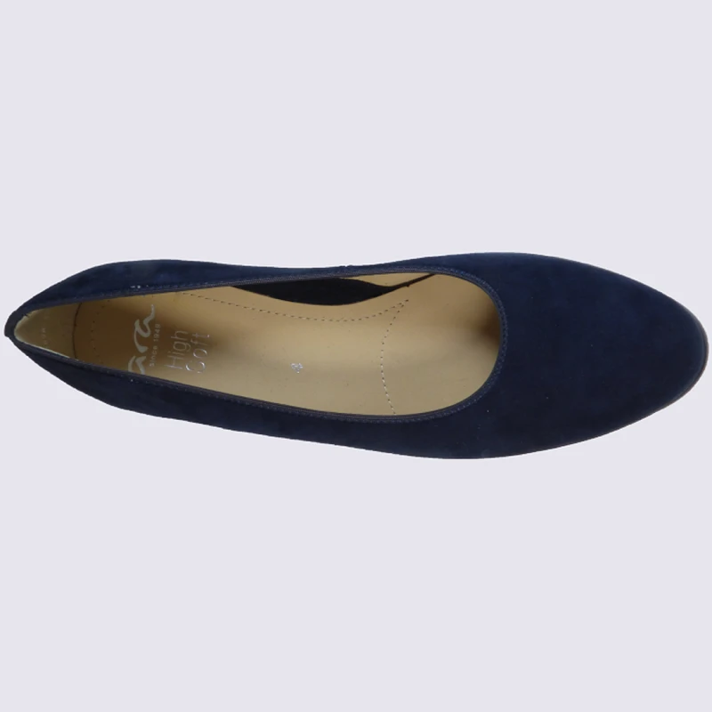 Escarpins confort de la marque Ara Cuir velours bleu Bord élastiqué Semelle intérieure en cuir avec coussinet confort Talon : 6 cm Composition : Cuir bleu Référence : 13436