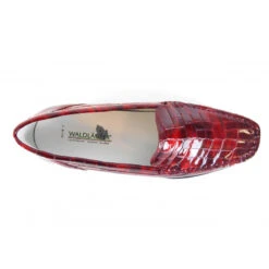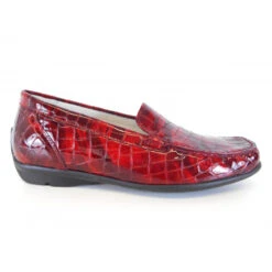 - Beau mocassin en cuir rouge vernis effet peau de croco.