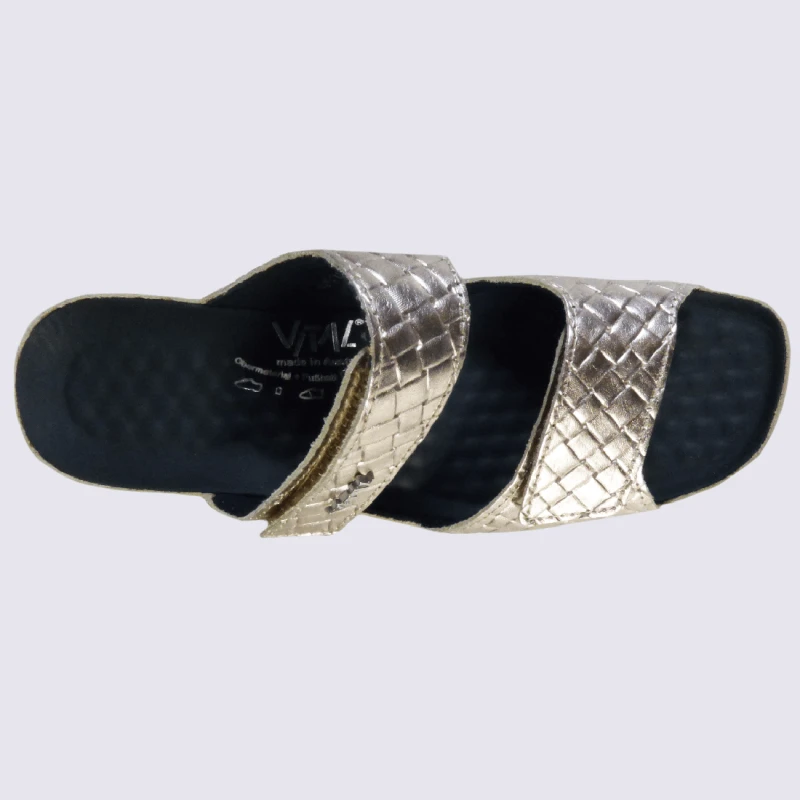 Pour ceux qui recherchent une touche de glamour et de confort pour cet été, les mules à talons de Vital en couleur dorée sont idéales. Fabriquées en cuir doré lumineux, elles promettent une marche fluide grâce à une semelle avant-gardiste. Elles comportent également une semelle intérieure munie de picots qui masse légèrement les pieds, garantissant ainsi un confort inégalé. Ces mules élégantes sont parfaites pour associer luxe et bien-être. Découvrez toute la collection Vital sur igert.fr !