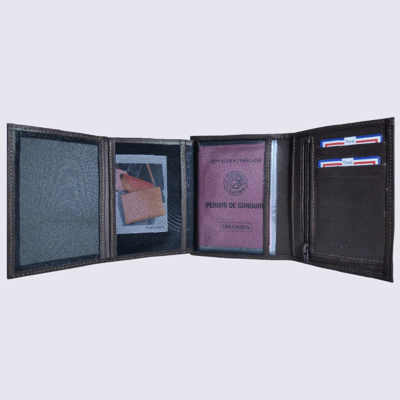 - IntĂ©rieur : 13 emplacements cartes, 1 poche zippĂ©e pour la monnaie, 3 volets rangement pour permis de conduire et/ou carte d’identitĂ©, 1 poche dorsale pour billets, 1 poche