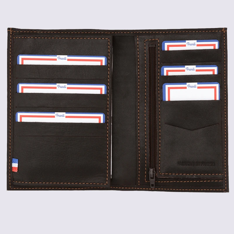 - IntĂ©rieur : 11 emplacements cartes, 1 poche transparente pour permis de conduire, 1 volet pour carte d’identitĂ©, 1 poche sur la droite pour vos papiers, 1 poche zippĂ©e pour la monnaie