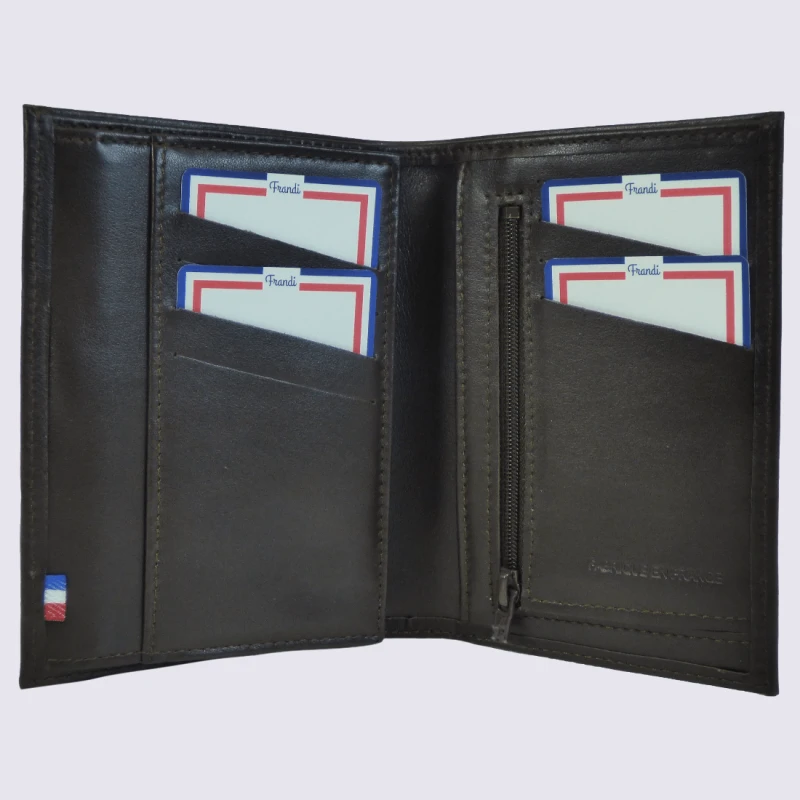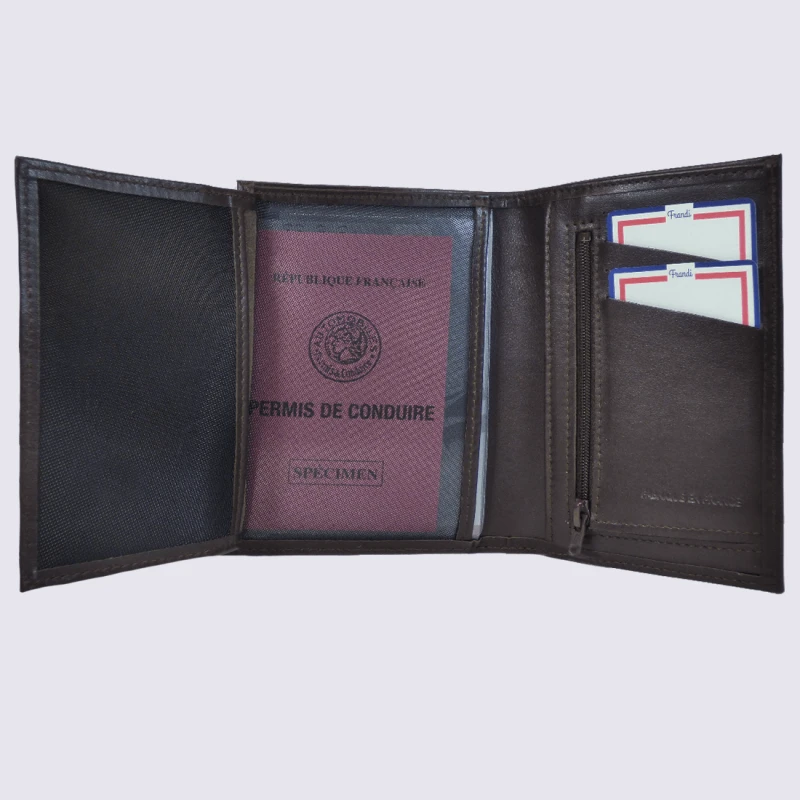 - IntĂ©rieur : 8 emplacements cartes, 1 emplacement pour la carte d’identitĂ©, 1 poche sous la fermeture zippĂ©e (pour les papiers), 1 emplacement pour la monnaie zippĂ©e avec petit soufflet , 1 emplacement permis de conduireÂ