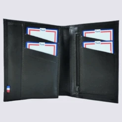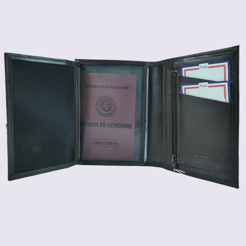 - IntĂ©rieur : 8 emplacements cartes, 1 emplacement pour la carte d’identitĂ©, 1 poche sous la fermeture zippĂ©e (pour les papiers), 1 emplacement pour la monnaie zippĂ©e avec petit soufflet , 1 emplacement permis de conduireÂ