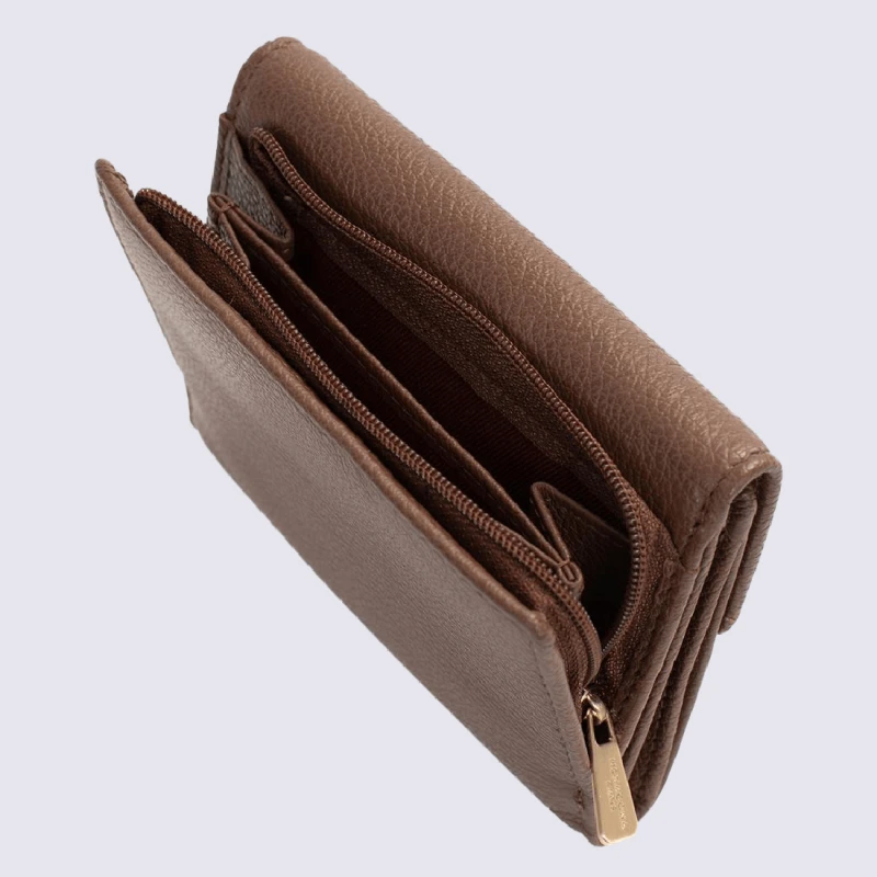 - Intérieur : 1 volet, 1 porte-monnaie zippé à 2 compartiments, 4 poches plates, 6 emplacements carte, 1 poche billets