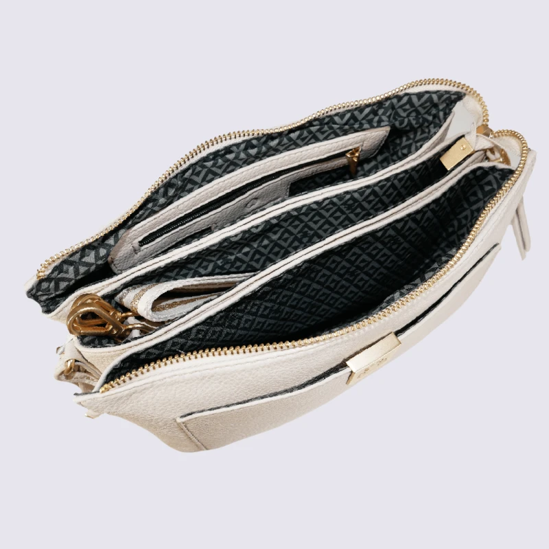- Intérieur : 3 compartiments, 1 poche simple, 1 poche zippée, doublure en textile imprimé