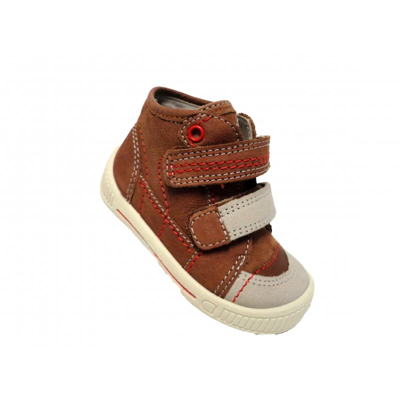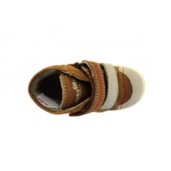 Modèle à double bride velcro  en dessus cuir nubuck couleur gingembre doublĂ© cuir languette matelassĂ©e semelle intĂ©rieure cuir amovible pour une meilleure hygiène semelle renforcĂ©e Ă l’avant et l’arrière.