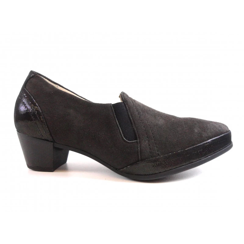 Loafer femme à talon en cuir marron nubuck et cuir imprimé brillant. Modèle à largeur H, adapté pour les pieds larges. Semelle intérieure amovible Talon : 45mm Composition : cuir, intérieur cuir Référence : 590513